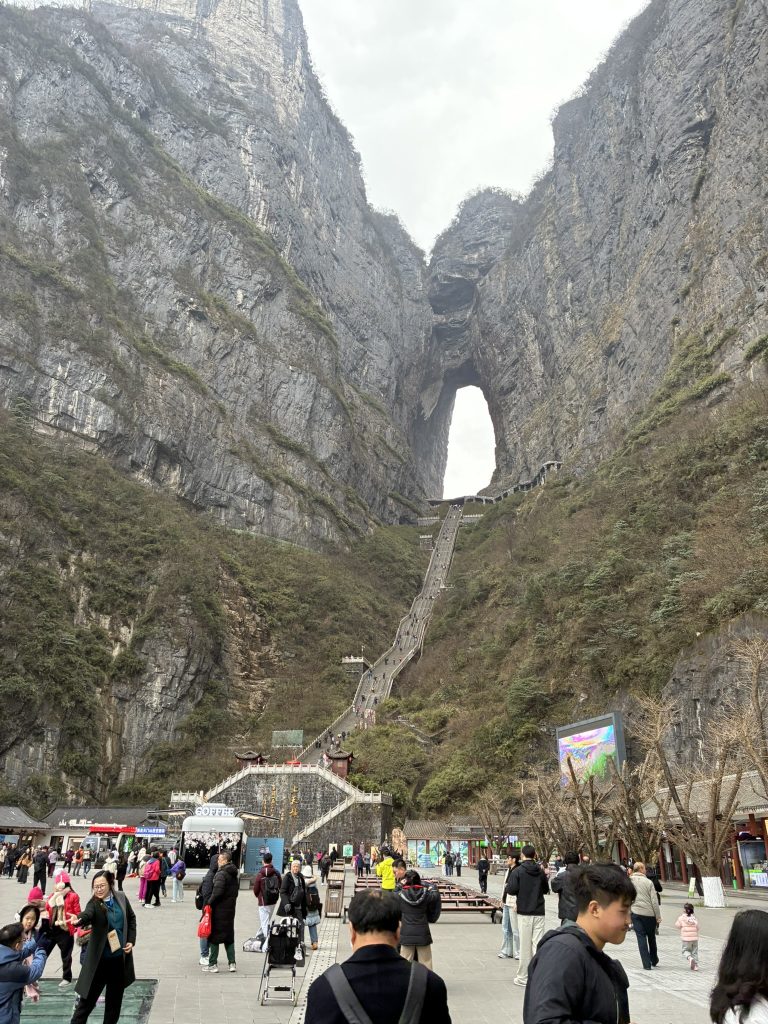 The first stop was Tianmen Mountain Forest Park which involves a cable car and a shuttle bus which navigates a spectacular 11km  mountain road with 99 switchback turns ending at an altitude of 1,100 metres.   The road ends at a large square at the bottom of the spectacular Heaven’s Gate or Tianmen Cave – a massive arch which inspired the Avatar movie. To get to the entrance of the Gate you have a choice of escalators running inside mountain tunnels or to climb the 45-degree slope 999 steps.  Geoffrey took the steps and beat me and guide to the top although he did suffer a bit of vertigo on the way up.  At the top there is the Biye Yaotai Old Growth Forest, Tianmen Temple, glass walkways (not too scary) and great views if the fog and clouds allow.